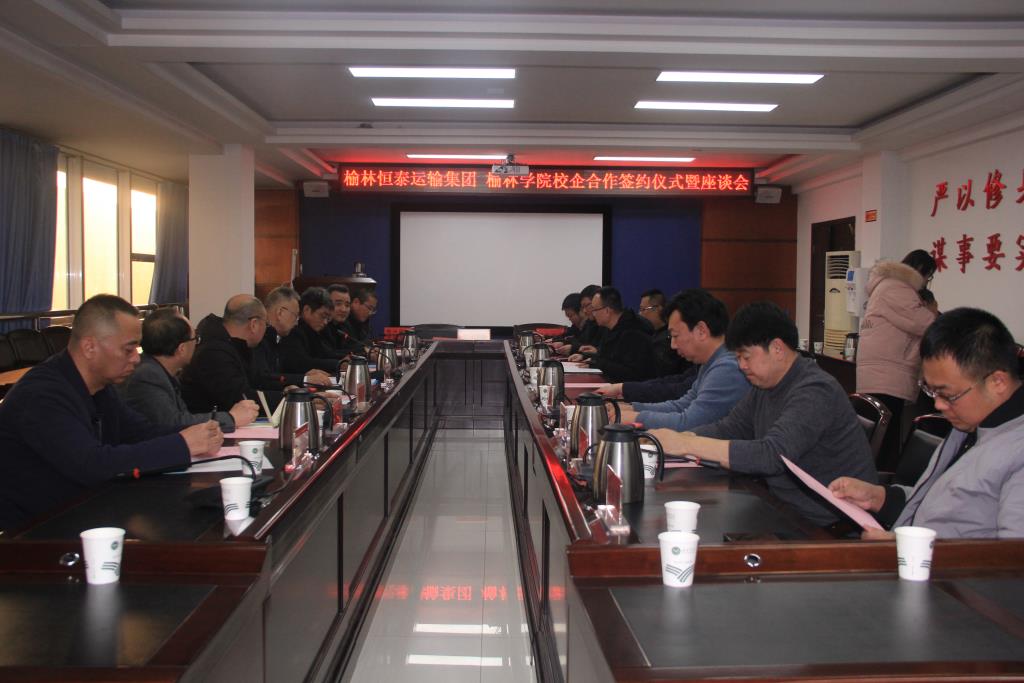 2020年12月23日,榆林學(xué)院、榆林市恒泰汽車運(yùn)輸集團(tuán)有限公司校企合作簽約儀式暨座談會議在榆林學(xué)院綜合樓舉行,榆林學(xué)院校長許云華、黨委副書記李治山、??蒲刑?、教務(wù)處、人事處、學(xué)生處及藝術(shù)、文學(xué)、管理學(xué)院負(fù)責(zé)人,恒泰運(yùn)輸集團(tuán)董事長、總經(jīng)理喬宏澤,黨委副書記、副總經(jīng)理張群,副總經(jīng)理喬建斌及總部有關(guān)部室負(fù)責(zé)人出席座談會。榆林學(xué)院科研處處長亢福仁主持了活動。