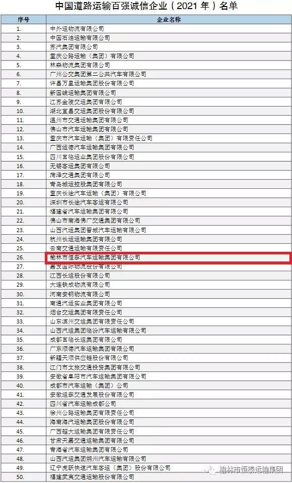 近日,由中國道路運輸協(xié)會主辦的中國道路運輸百強誠信企業(yè)創(chuàng)建活動經(jīng)過前期宣傳動員、策劃組織、接受申報、統(tǒng)計計算、材料復(fù)核及審核評估等工作,現(xiàn)已圓滿落幕,并對“中國道路運輸百強誠信企業(yè)(2021年)”名單予以對外公告,榆林市恒泰汽車運輸集團有限公司榮獲百強誠信企業(yè)稱號。中道協(xié)在該公告中指出:“中國道路運輸百強誠信企業(yè)創(chuàng)建活動是本會為會員企業(yè)服務(wù)、為全行業(yè)服務(wù)的一項重要的公益活動?;顒娱_展17年來,在各級交通運輸主管部門、道路運輸管理機構(gòu)和地方道路運輸協(xié)會的支持下,本會借鑒國際通行方法,結(jié)合行業(yè)實際,每年度對全國范圍內(nèi)道路運輸企業(yè)規(guī)模實力、競爭能力、影響力及誠信經(jīng)營活動進行科學(xué)評價,引導(dǎo)道路運輸企業(yè)創(chuàng)新發(fā)展、誠信經(jīng)營,對推進道路運輸行業(yè)調(diào)結(jié)構(gòu)、轉(zhuǎn)方式,實現(xiàn)可持續(xù)發(fā)展發(fā)揮了積極作用。百強誠信企業(yè)創(chuàng)建活動在行業(yè)內(nèi)外影響力和社會關(guān)注度持續(xù)提高,上榜企業(yè)知名度和公信力不斷增強,充分展示了我國優(yōu)秀道路運輸企業(yè)的群英形象”。